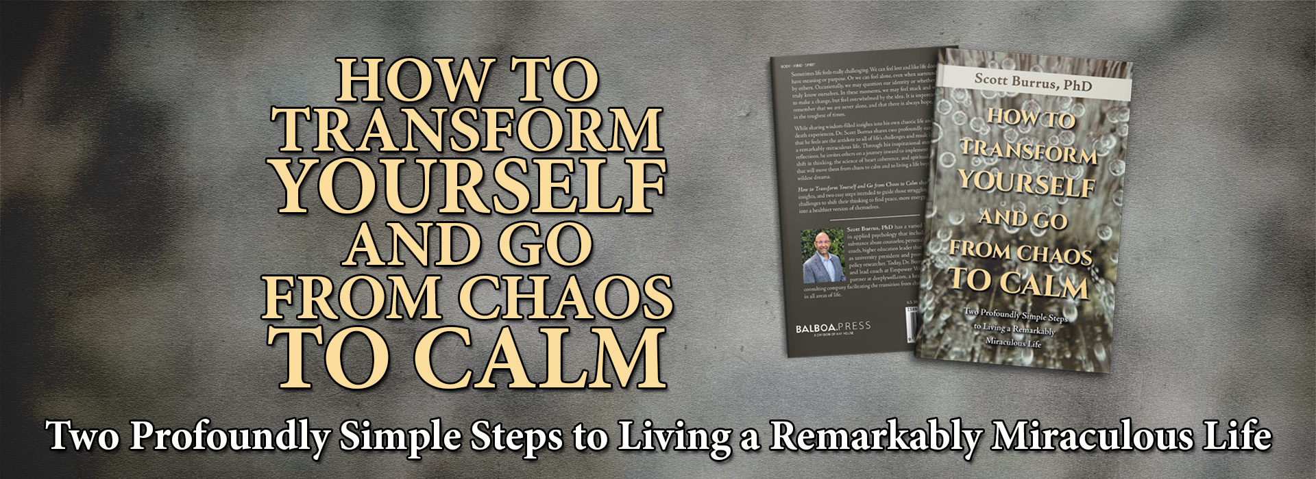 While sharing wisdom-filled insights into his own chaotic life and near-death experiences, Dr. Scott Burrus shares two profoundly easy steps that he feels are the antidote to all of life’s challenges and result in living a remarkably miraculous life. Through his inspirational stories and reflections, he invites others on a journey inward to implement a simple shift in thinking, the science of heart coherence, and spiritual wisdom that will move them from chaos to calm and to living a life beyond their wildest dreams.